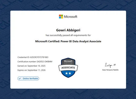 I have earned the PL-300: Power BI Data Analyst certification, which strengthened my ability to build end-to-end analytical solutionsโfrom data cleaning and modeling to interactive dashboards and business reporting.