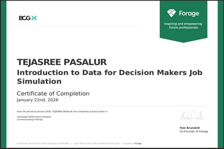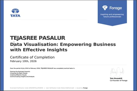 Hello! I’m Tejasree,a Detail-oriented Data Analyst Fresher with hands-on experience in data cleaning, data analysis, and dashboard development using Microsoft Excel, Power BI, and MySQL. Skilled at transforming raw datasets into meaningful insights, interactive dashboards, and actionable reports that support data-driven decision-making.